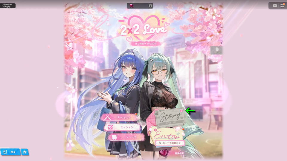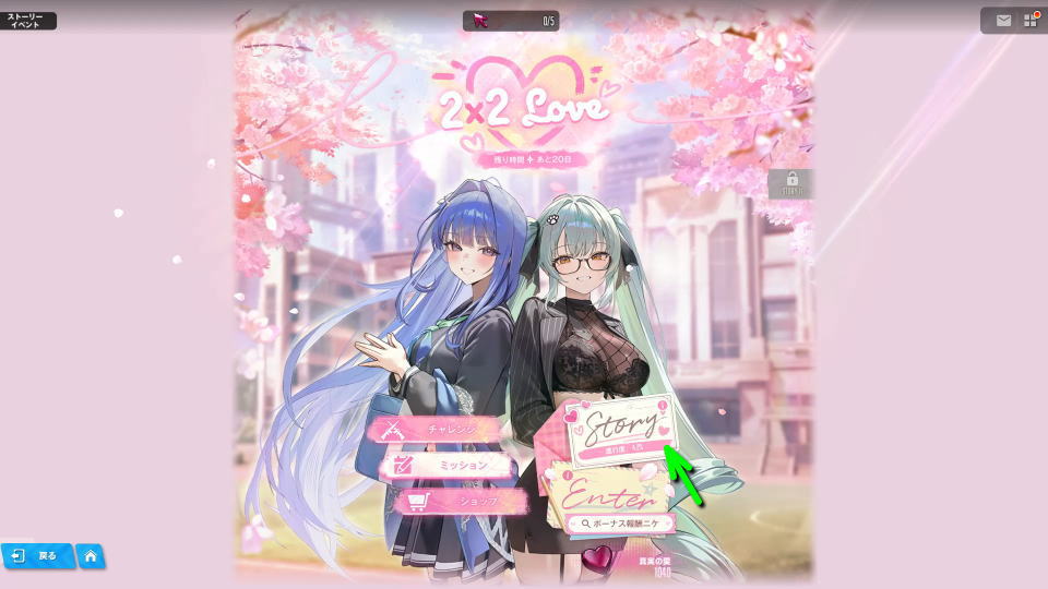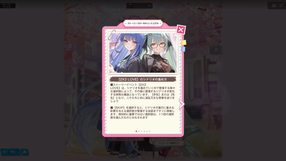 2X2 LOVEのチュートリアルを確認するには、イベントページの「STORY」右上にあるボタンを押します。