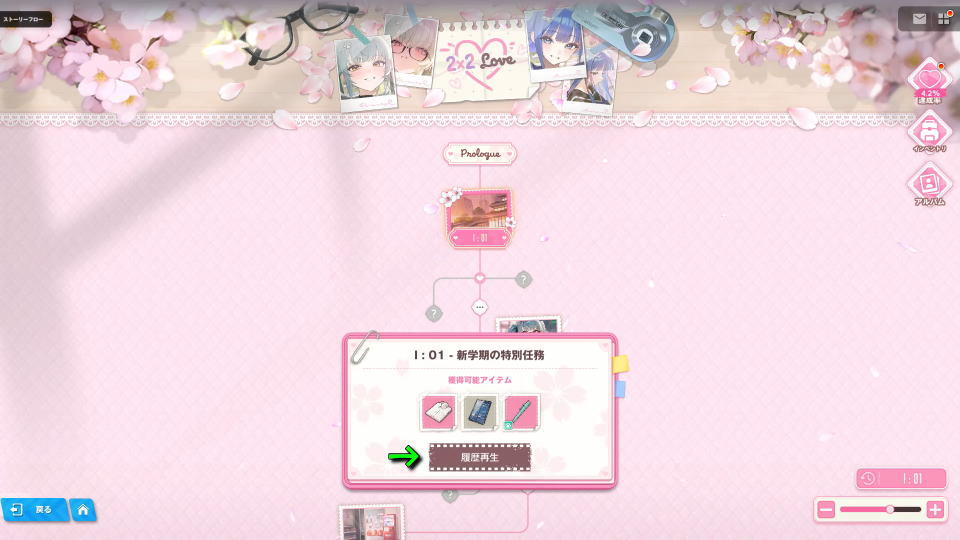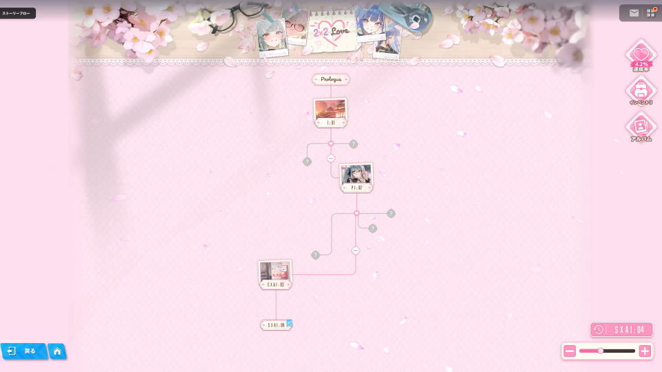 ■【2X2 LOVE】では、記録保管所システムが存在しません。その代わり、【ストーリーフロー】システムで過去のシナリオをもう一度鑑賞したり、鑑賞できなかったシナリオルートをオープンできるようになります