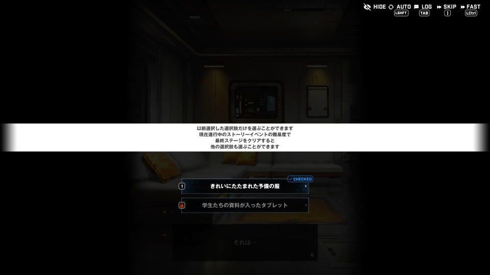 ■【SKIP】を選択すると、シナリオの進行に重大な影響を与える選択肢が登場する会話まですぐに移動します。相対的に重要ではない選択肢は、1つ目の選択肢を選んだものとみなされます