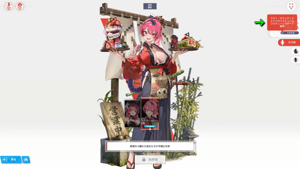 マスト:ロマンチックメイドのコスチュームガチャは、ロビー左側の専用ボタンから挑戦できます。