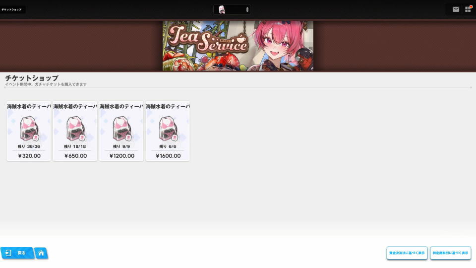 メニュー上部の「チケットショップ」では、専用のガチャ券「海賊水着のティーバッグ」が購入できます。