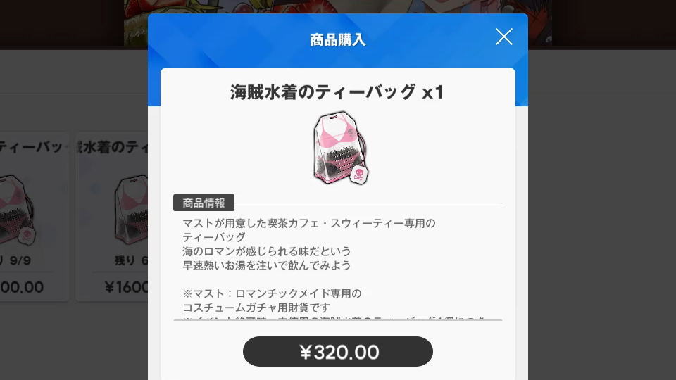 | 海賊水着のティーバッグ×1 | 320円 | 36 | 11,520円 | @320 |