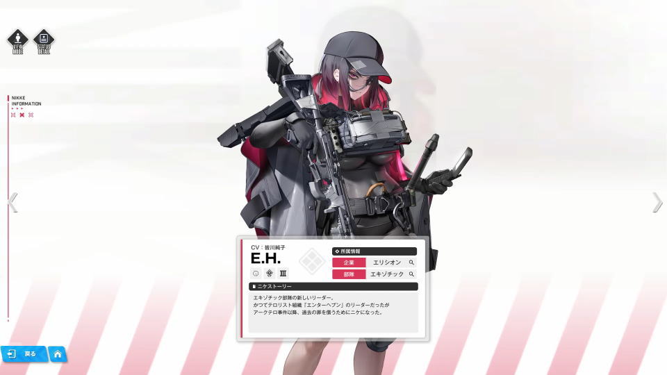 E.H.は特定の条件を達成するたびに、廃品を回収して自分の攻撃能力を強化する火力型ニケ