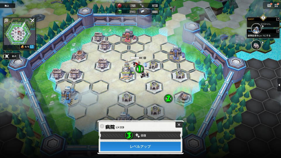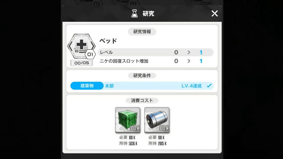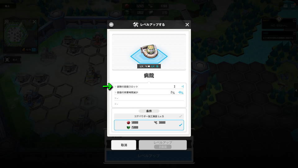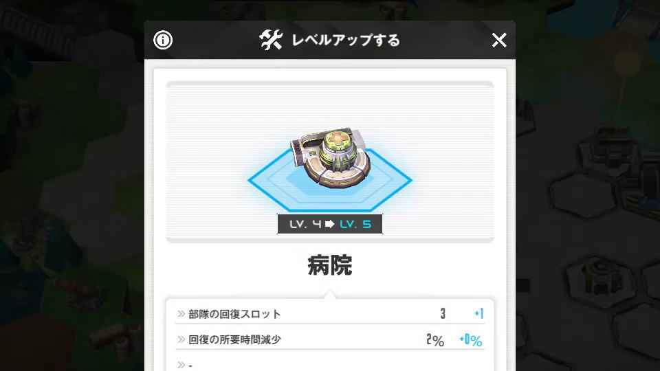 病院のレベルアップを行うと、重要な「部隊の回復スロット」が増加してニケの回復効率が高まります。
