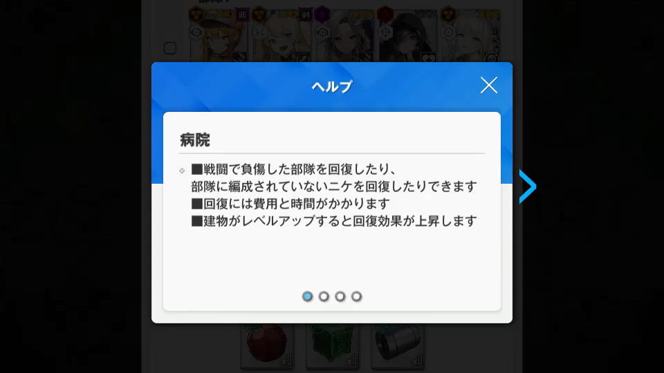 ・病院では戦闘で負傷した部隊や、部隊に編成されていないニケの回復ができる