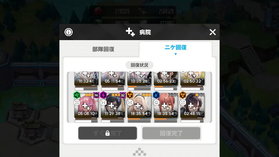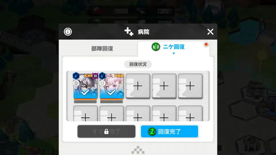 例えば戦闘不能のニケが2体いる場合でも、約20時間ではなく数時間程度で完全に回復するのです。
