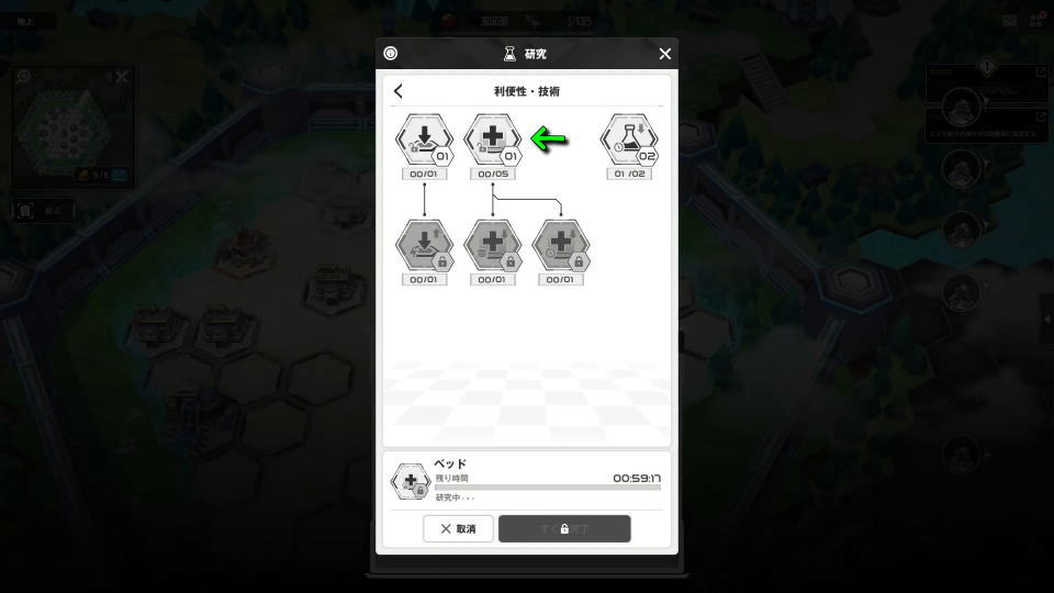 部隊の回復スロットを増やすもう一つの方法は、拠点の「研究」から「利便性・技術」の中にある「ベッド」を選択することです。