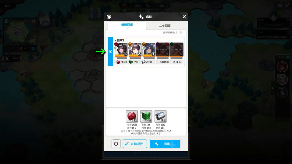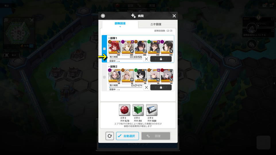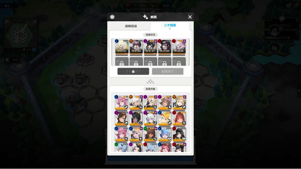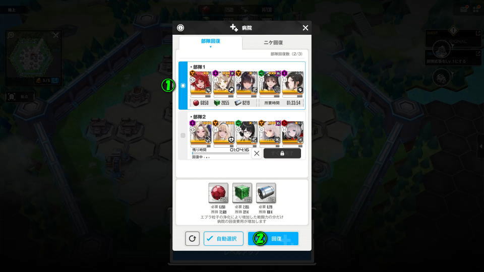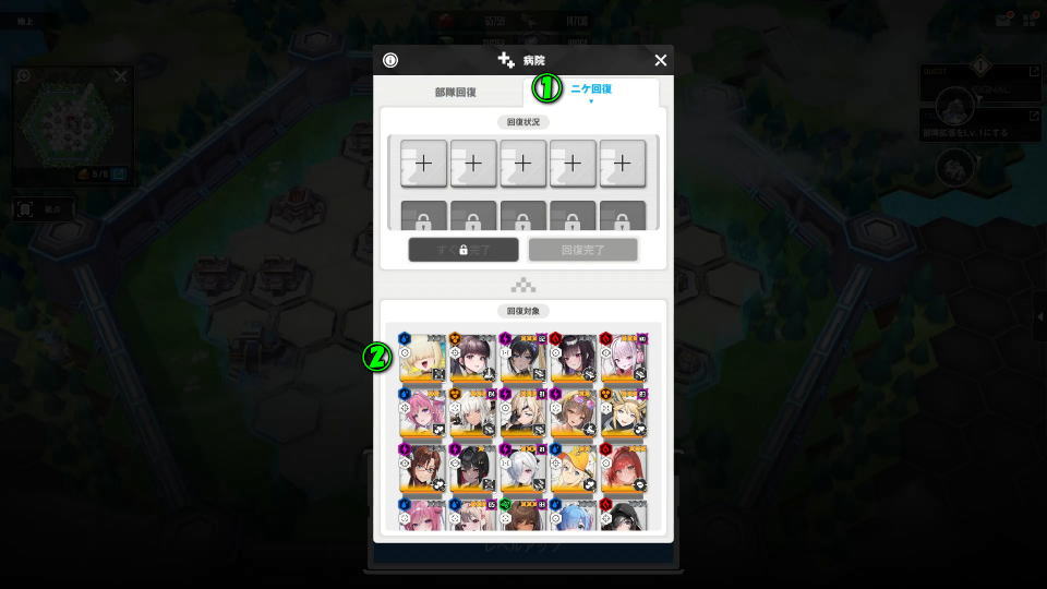 NIKKEの地上で回復を行うには、部隊を占領エリア内に入れて「病院」から「回復」を選択します。