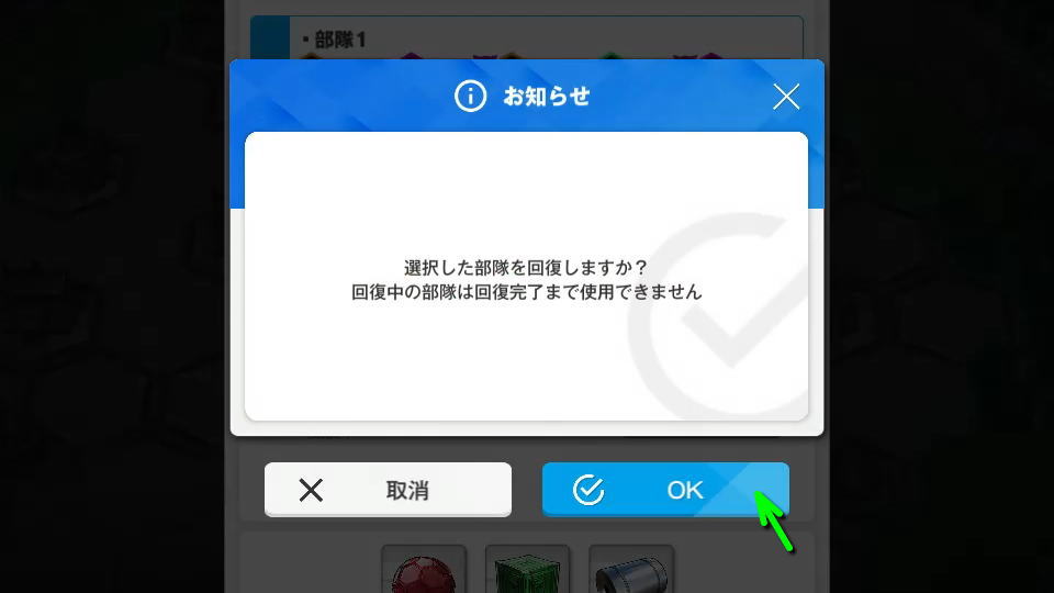 『選択した部隊を回復しますか?』というメッセージが表示されたら、内容を確認して「OK」します。