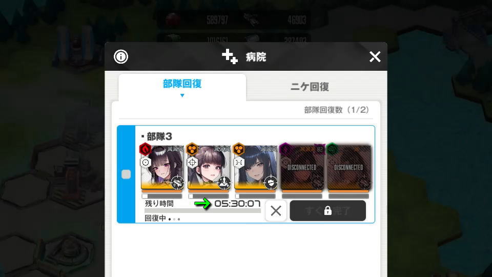 例えばリタイアしたニケが2体いる場合でも、約20時間ではなく数時間程度で完全に回復するのです。