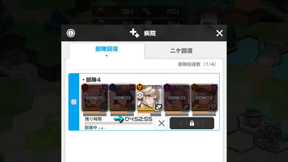 もちろん戦闘不能のニケが4体いる場合でも、数時間で全快します。