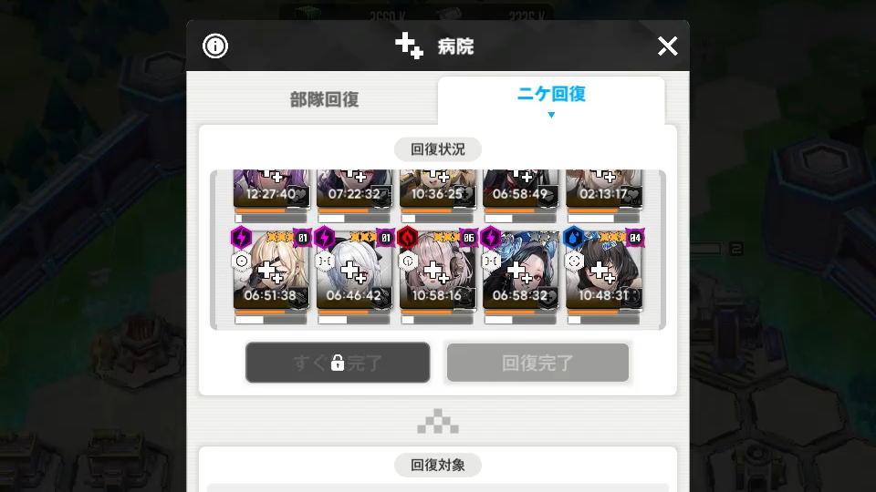 ニケ回復を行って十分に時間が経過したら「ニケ回復」タブから「回復完了」を選択します。
