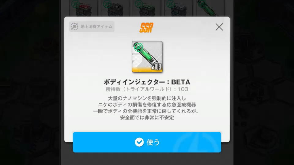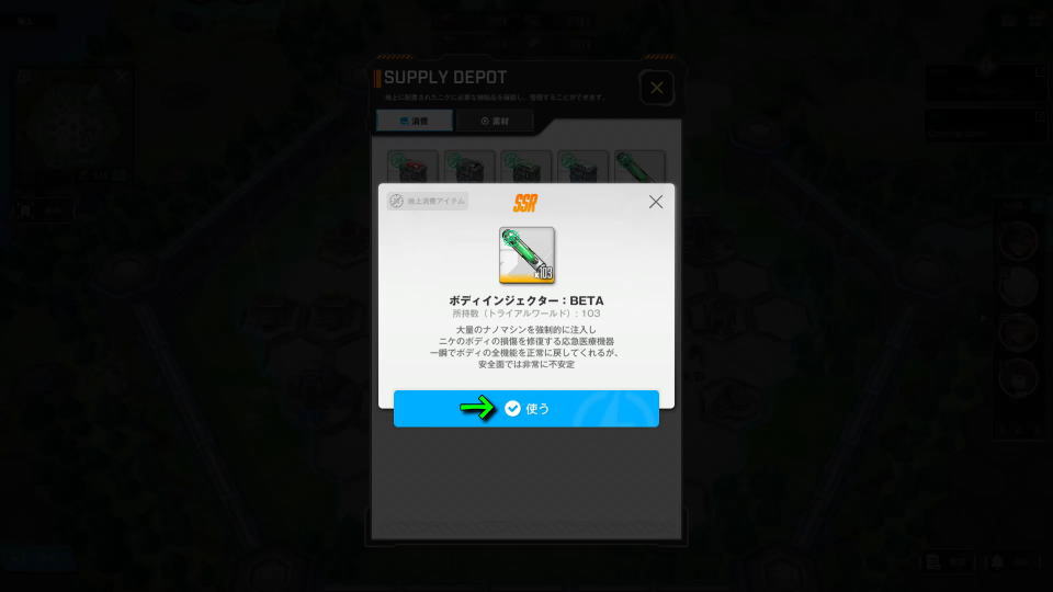 そのアイテムが「ボディインジェクター:BETA」であることを確認したら「使う」を選択します。