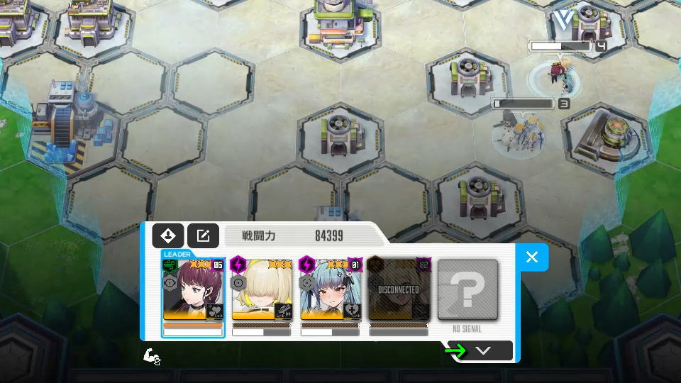 体力(HP)の確認は、部隊を選択した際に表示されるニケのアイコンとその直下のバーで確認できます。