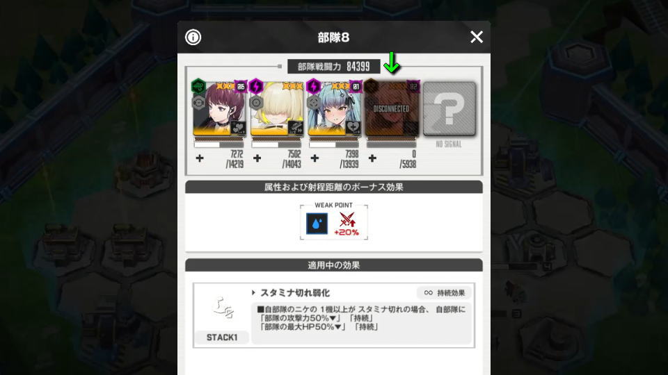 このとき図示したボタンを選択すると、部隊の情報が拡大されスタミナと体力がわかりやすくなります。