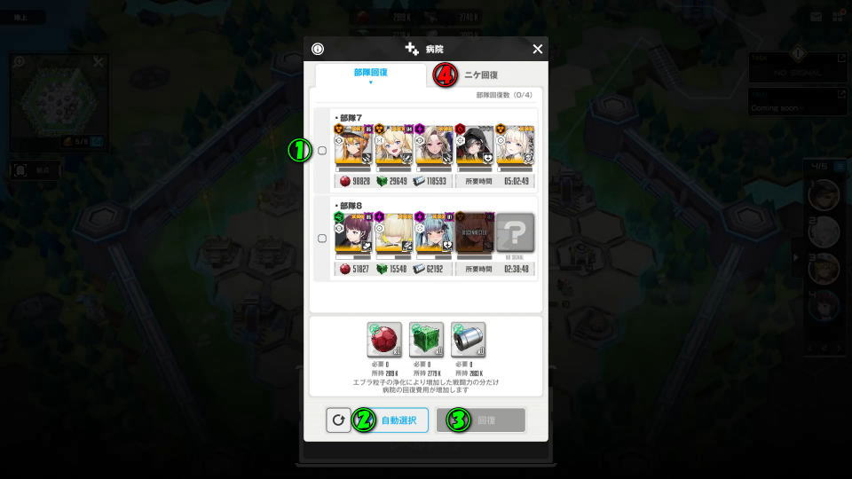 病院を選択したら対象の部隊を選び、場合によっては「自動選択」を使って「回復」で確定します。