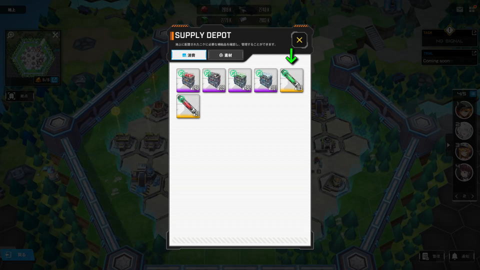 補給庫の中身が表示されたら「緑色の注射器」のようなアイテムを選択します。