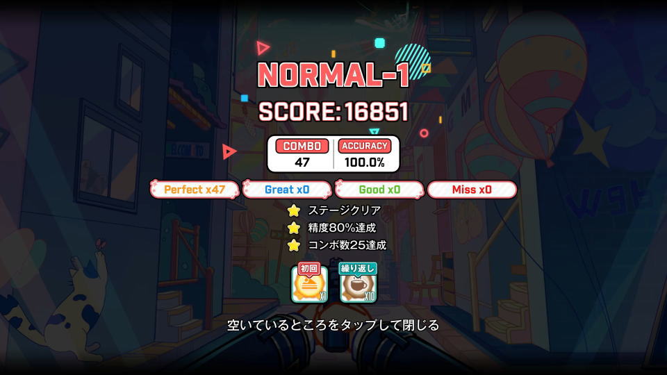 各ステージをクリアすると、そのステージの成績やスタンプの獲得状況が表示されます。