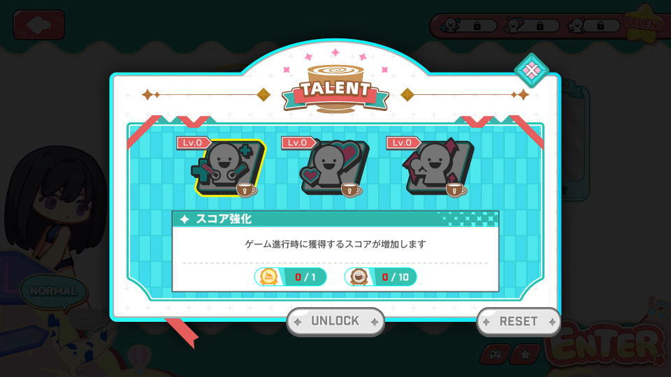 ③のTALENTボタンでは、コーヒースタンプや限定スイーツスタンプでゲームの難易度を下げられます。
