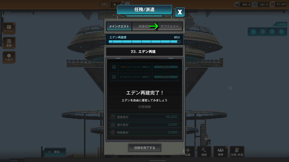 報酬は「エデン再建度」に比例しており、100%にならない場合は「サブクエスト」を確認します。