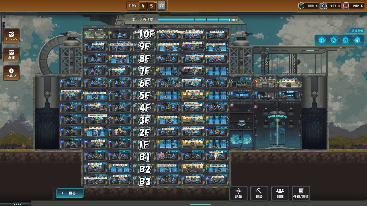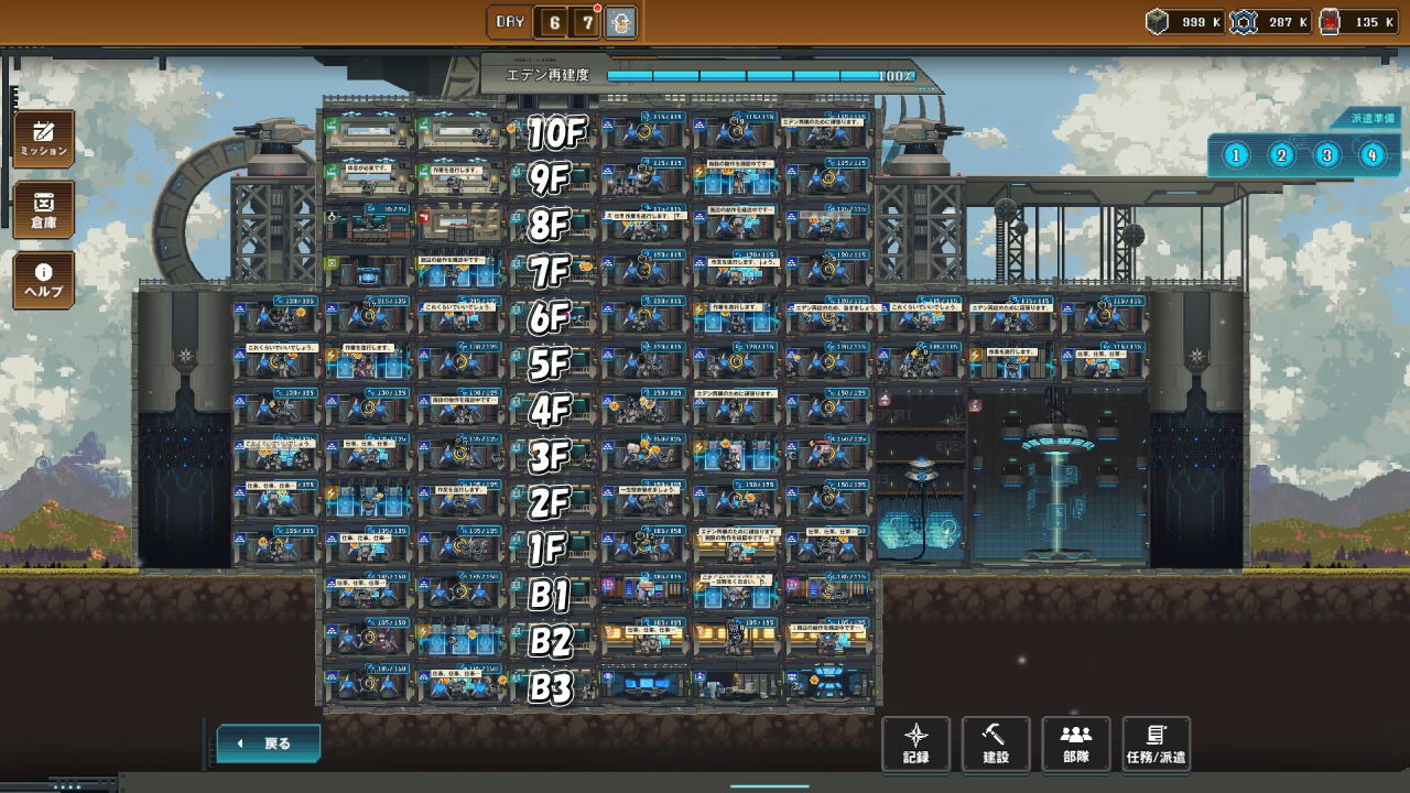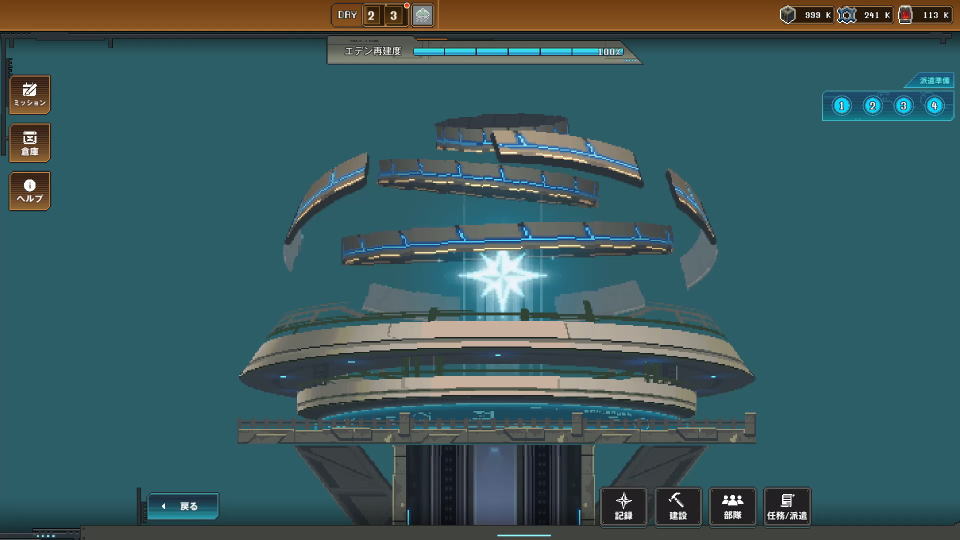 エデン内部に発電所や施設収集所を建設し、キャラクターに似たロボやユニットを配置するREBUILD EDEN。