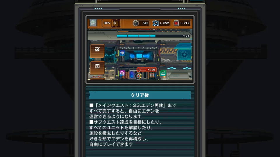 ・サブクエスト達成を目標にしたり、すべてのユニットを解雇したり、施設を撤去したりするなど好きな形でエデンを再構成し、自由にプレイできます