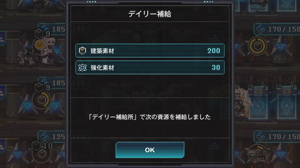 デイリー補給所の効果は、クリア済みの状態ですら「建築素材×200、強化素材×30」です。