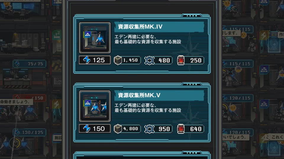 施設はイベントの進行に応じて解除されていき、資源収集所は最終的に「MK.V」まで解除されます。