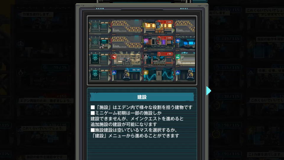 ・ミニゲーム初期は一部の施設しか建設できませんが、メインクエストを進めると追加施設の建設が可能になります