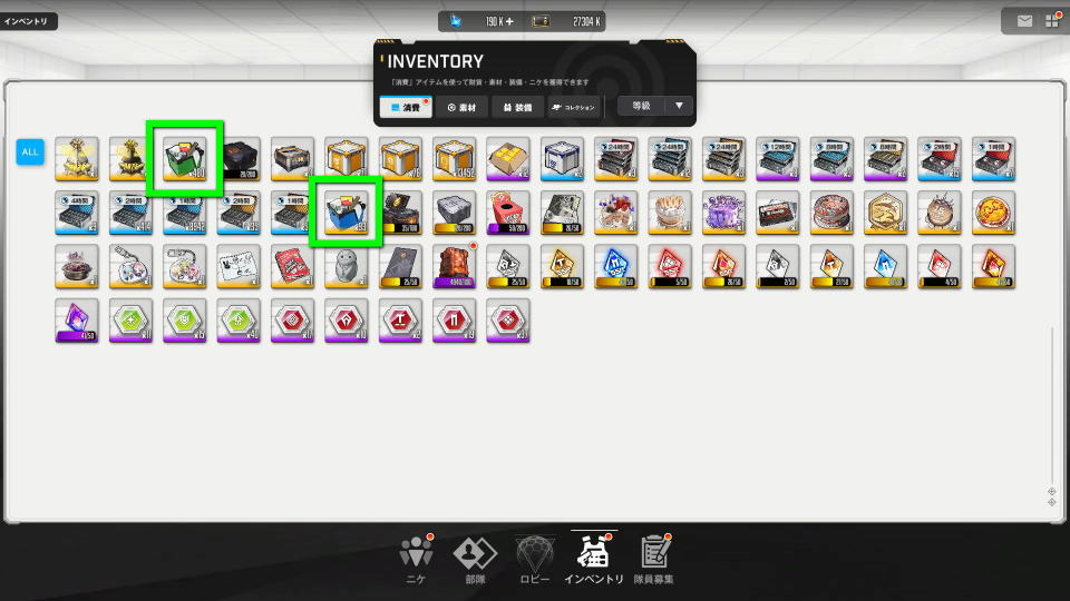 宝もの素材の確保に「素材交換」で間に合わない場合は、インベントリの「がらくたボックス」を使います。