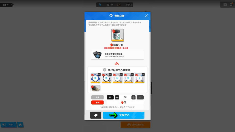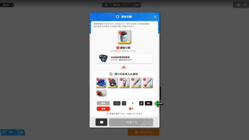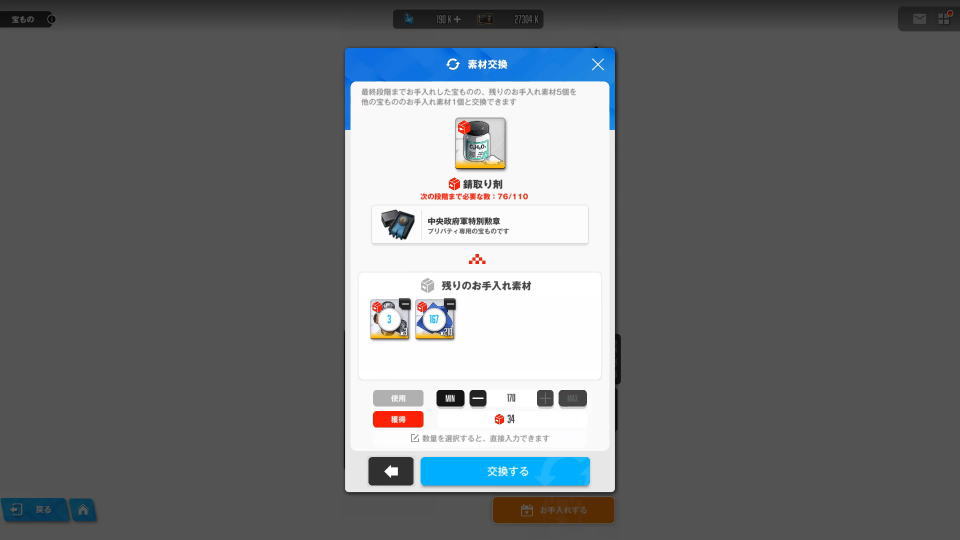 しかしアップデート直後はすぐに十分な量が入手できないため、お手入れ素材の「素材交換」を利用します。