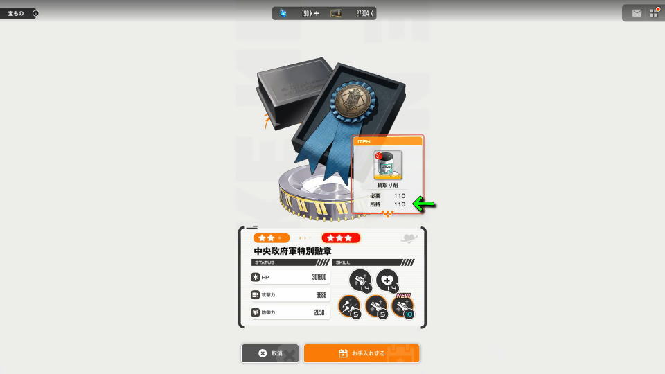 各ニケの宝ものは最大3段階まで強化できますが、2段階から3段階の強化に素材が「110個」必要です。