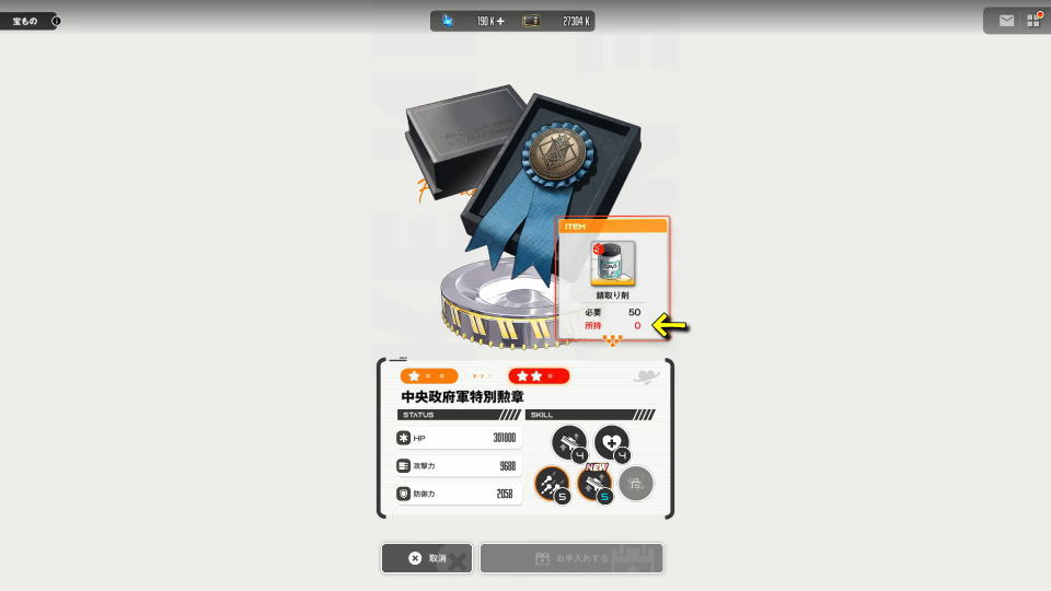 すると、宝ものの第一段階から第二段階までの強化に必要な素材が「50個」入手できました。
