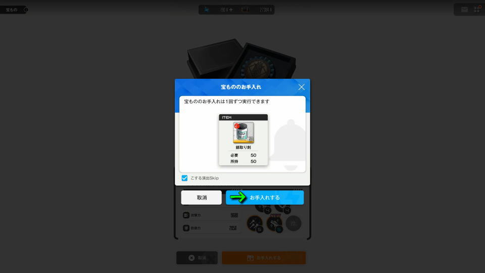 宝ものの画面に移動すると「お手入れ」が行えますが、これまでとは違い「専用素材」が必要になります。
