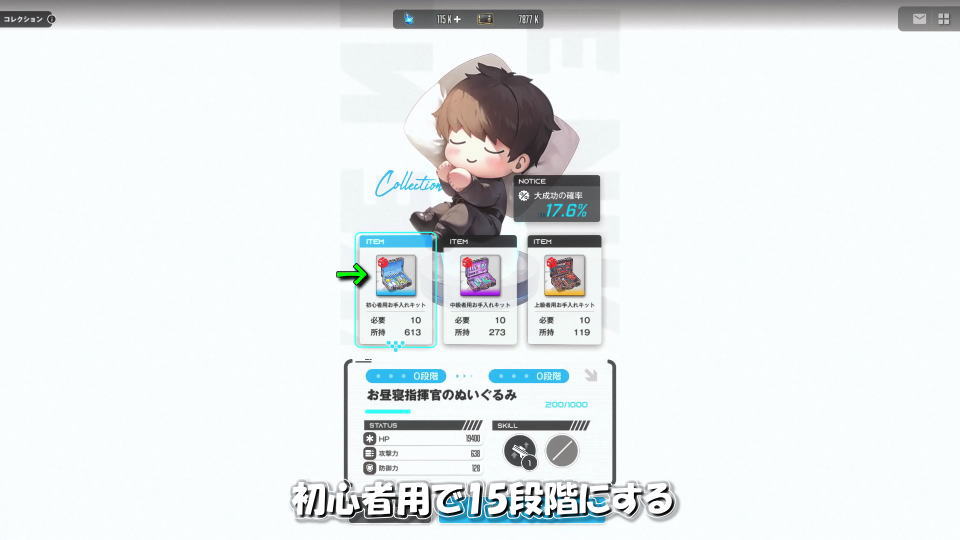 この時「初心者用お手入れキット」を使い15段階に到達させます。