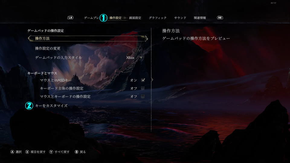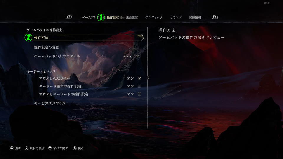 設定に移動したら上部メニューの「操作方法」から、ゲームパッドの操作設定の項目にある「操作方法」を選択します。