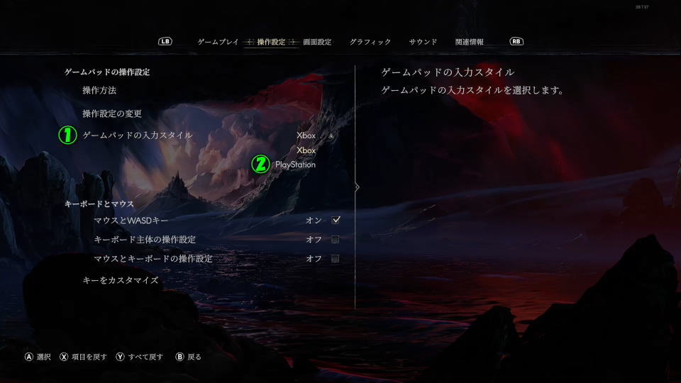 コントローラーの入力スタイルの変更は、前述した「操作方法」からゲームパッドの操作設定の項目にある「ゲームパッドの入力スタイル」を選択します。
