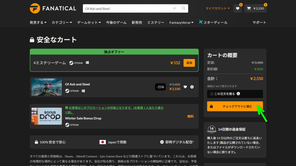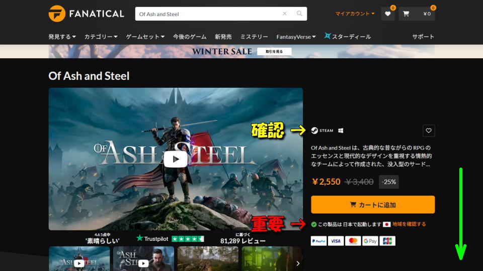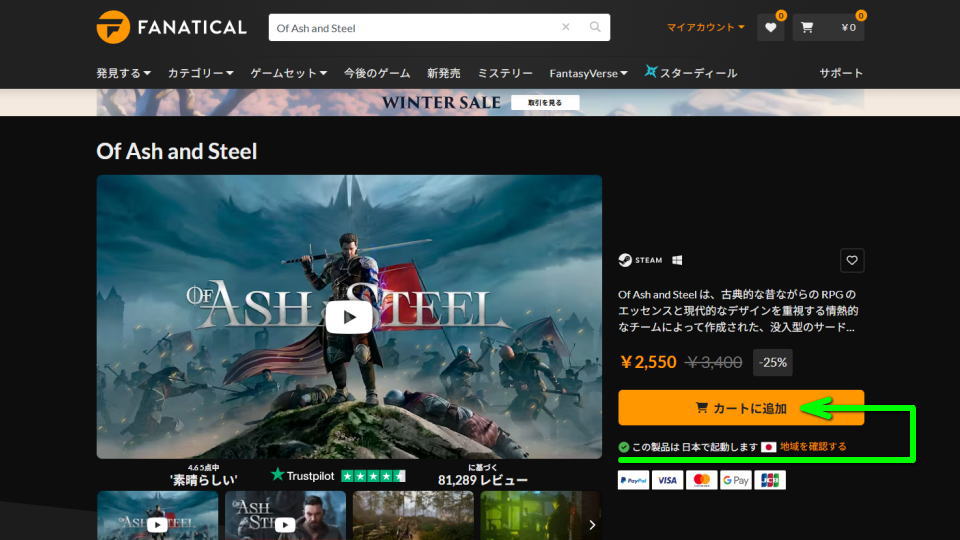 Fanaticalに移動したら「Of Ash and Steel」を検索し、詳細ページに進みます。