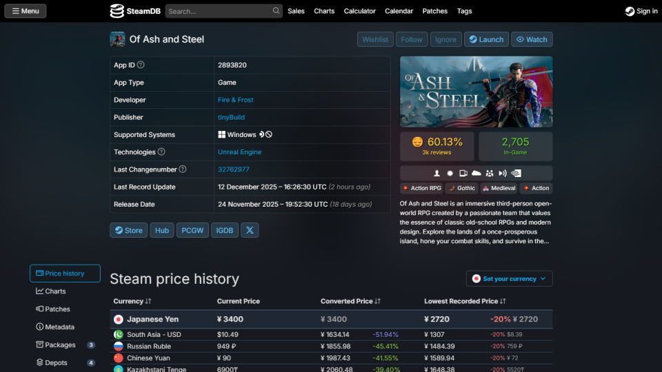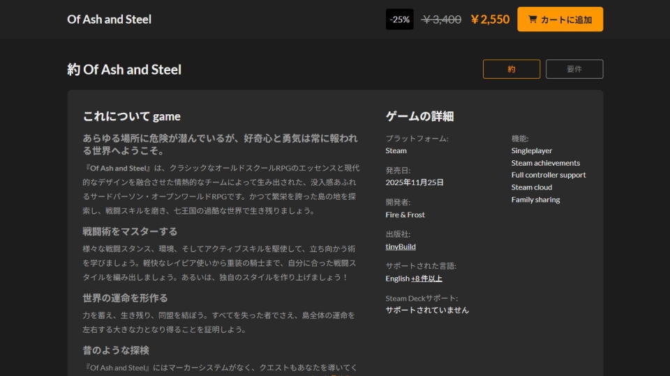 Of Ash and Steelが表示されたら、プラットフォームや日本認証などを確認して画面を下にスクロールします。