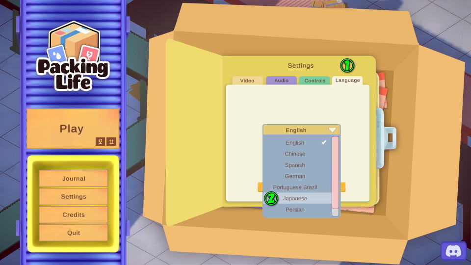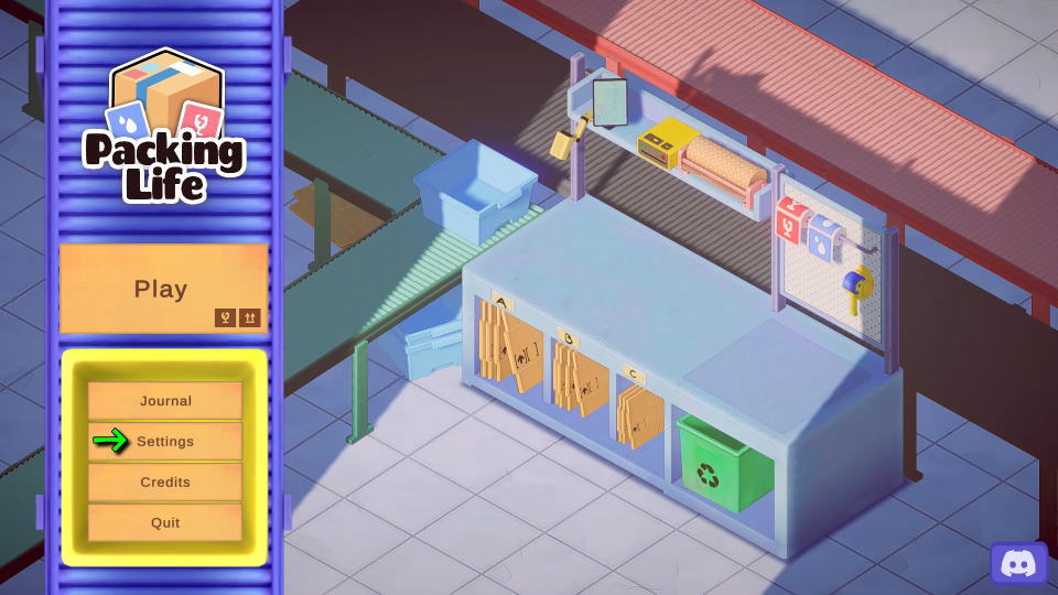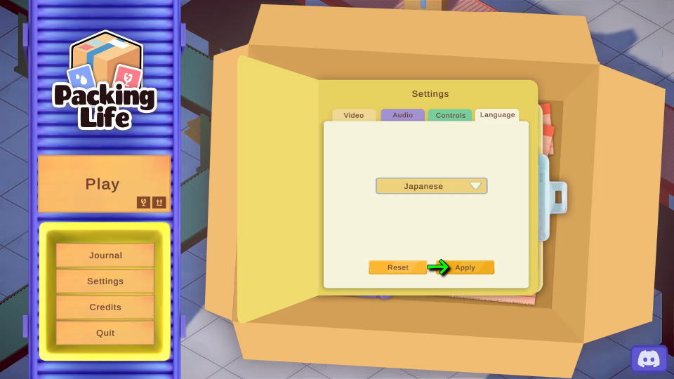 Packing Lifeを日本語化するには、タイトルメニューから「Settings」に進みます。