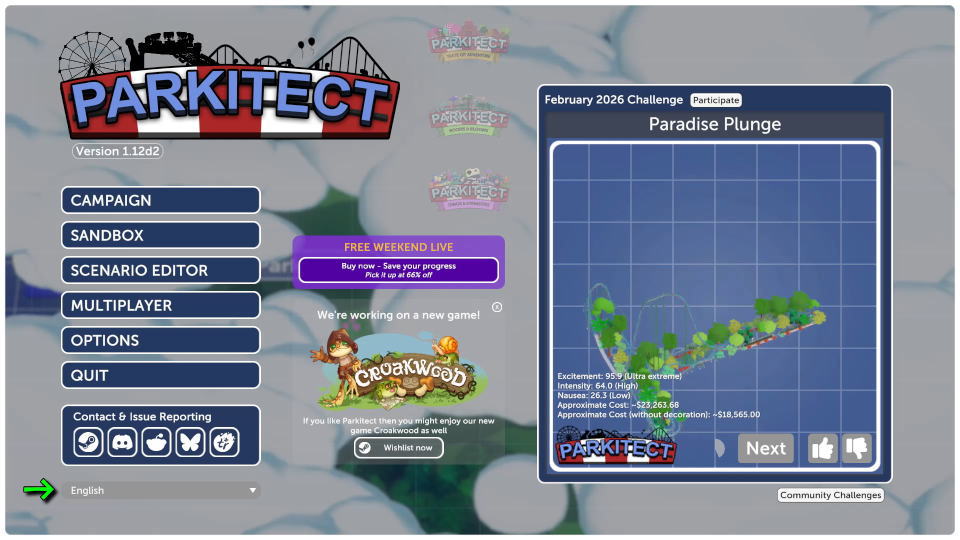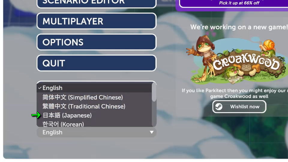 Parkitectを日本語化するには、タイトルメニュー左下にある「English」を選択します。