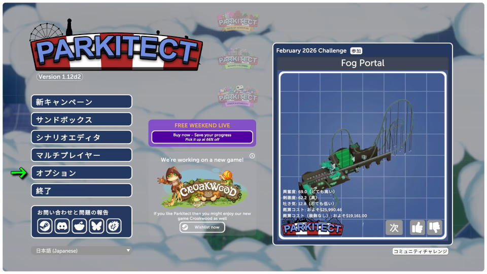 Parkitectの操作を確認するには、日本語化済みのタイトルメニューから「オプション」に進みます。