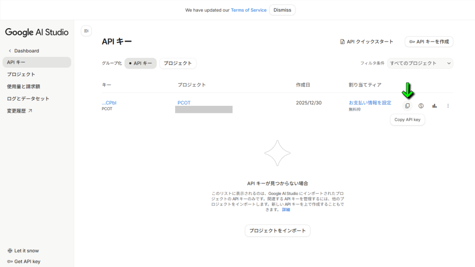Gemini API キーが作成されたら、画面右側にある「Copy API key」でAPIキーをコピーします。