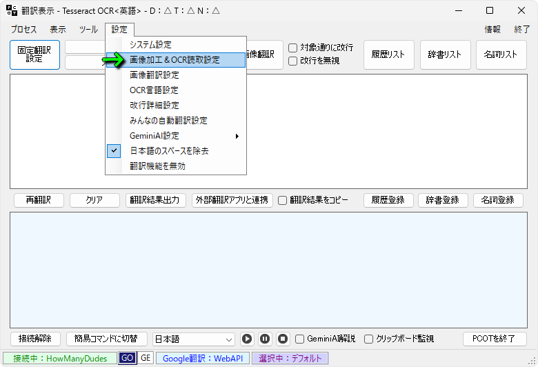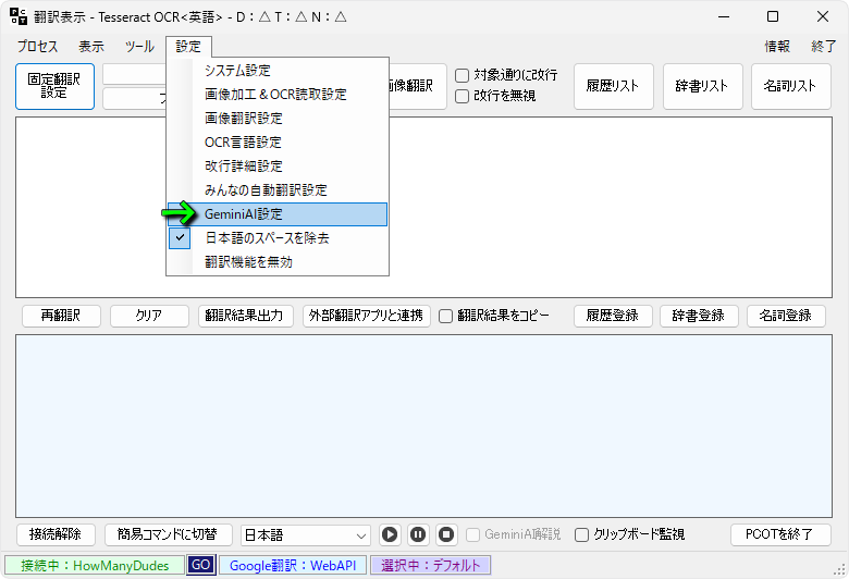 PCOTが起動したら「設定」から「GeminiAI設定」を選択します。