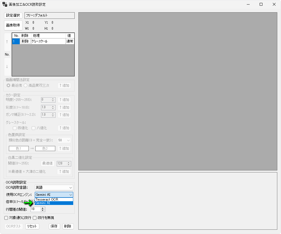 画面下部にある『OCR読取設定』で、使用OCRエンジンに「Gemini AI」を指定して「保存」します。
