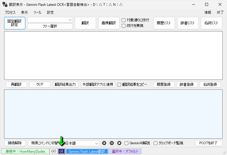 最後に画面下部の『GO』の右側にある「GE」を選択し、Gemini Flash Latest翻訳になることを確認します。