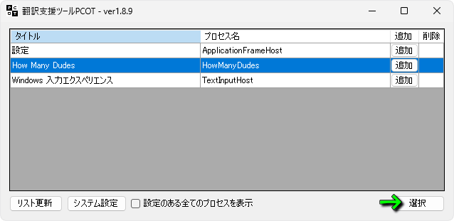 Geminiと連携するため、PCOTを起動して「任意のプロセス」を選択します。