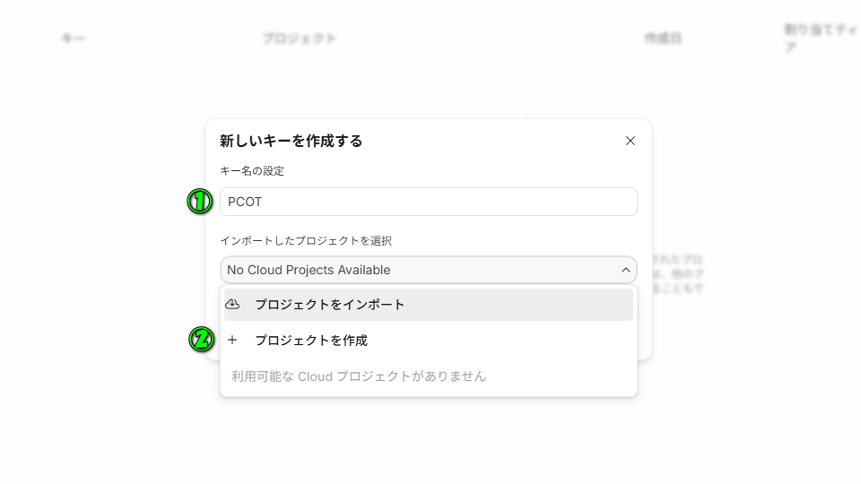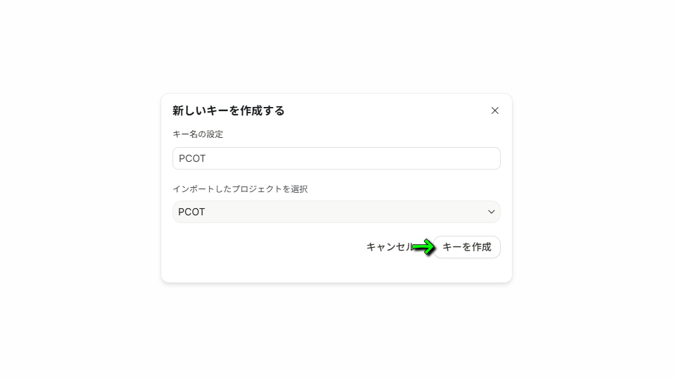 『キー名の設定』に例として「PCOT」と入力し、その下にある『インポートしたプロジェクトを選択』で「プロジェクトを作成」を選択します。