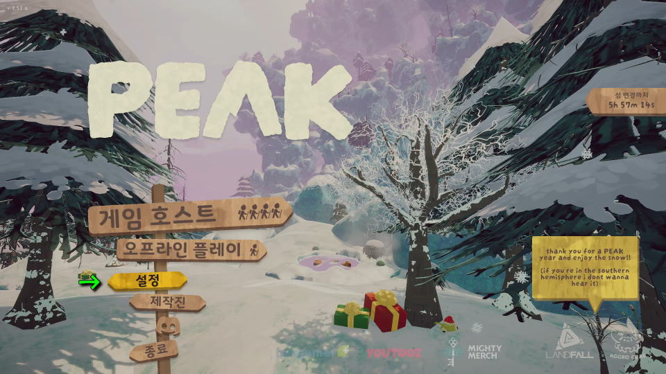 PEAKを日本語化するには、タイトルメニューから上から3番目の設定を表す「설정」に進みます。