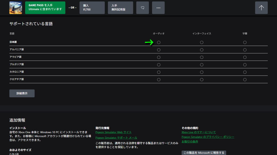 Pigeon Simulatorの商品ページでは「日本語対応」となっていますが、ゲーム内では確認できませんでした。